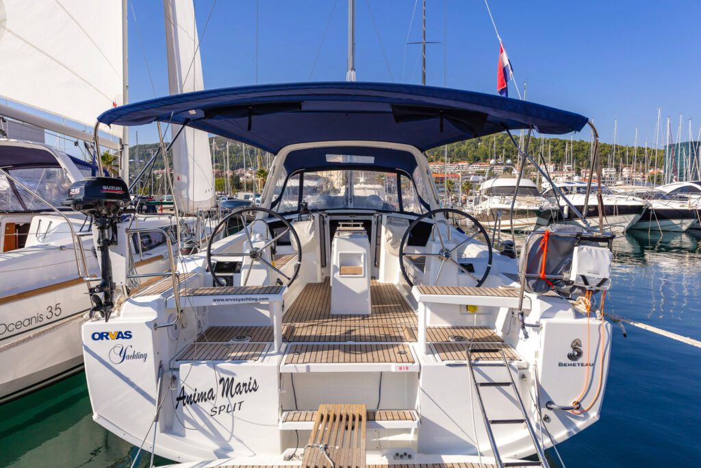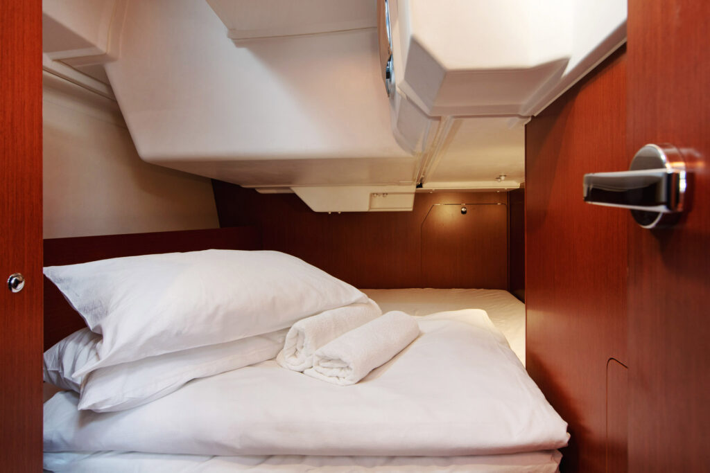 Esimerkkialus: Purjevene Beneteau Oceanis 38.1. Makuupaikkoja 6, Hyttiä 3, WC/suihku 2, sänkyä salongissa 2, harmaavesisäiliö.